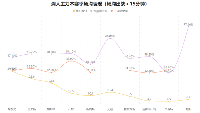 八村此战的23分不算多但他出手了11次命中了9球,这个得分效率可谓非常高效,虽然在湖人的主力阵容里八村是毫无争议的角色球员,他的场均得分也不过12.5分,但他却具备10名主力球员中最高的三分命中率,可以说即使有过单场较为低迷的时刻但总体来看他就是湖人的最佳射手,球队需要他做出进攻端的贡献。