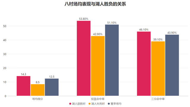 因此在湖人的体系中他的发挥非常重要,本赛季当湖人获胜时,八村场均贡献14.3分,两项命中率分别为53.8%与46.1%;当湖人失利时,八村场均仅贡献8.5分,两项命中率分别为42.7%与39.1%,这意味着八村的得分产量以及效率对湖人的胜负产生了较大的影响,而他发挥越好湖人获胜的可能性也就越大。